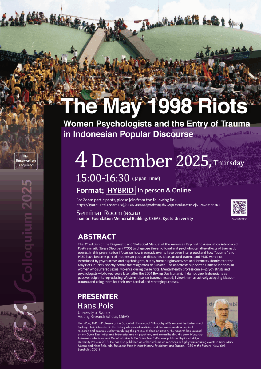 The 3rd edition of the Diagnostic and Statistical Manual of the American Psychiatric Association introduced Posttraumatic Stress Disorder (PTSD) to diagnose the emotional and psychological after-effects of traumatic events. In this presentation I focus on how traumatic events have been interpreted and how “trauma” and PTSD have become part of Indonesian popular discourse. Ideas around trauma and PTSD were not introduced by psychiatrists and psychologists, but by human rights activists and feminists shortly after the May riots in 1998, shortly before the resignation of Suharto. These activists supported Chinese Indonesian women who suffered sexual violence during these riots. Mental health professionals—psychiatrists and psychologists—followed years later, after the 2004 Boxing Day tsunami. I do not view Indonesians as passive recipients reproducing Western ideas on trauma; instead, I view them as actively adopting ideas on trauma and using them for their own tactical and strategic purposes.