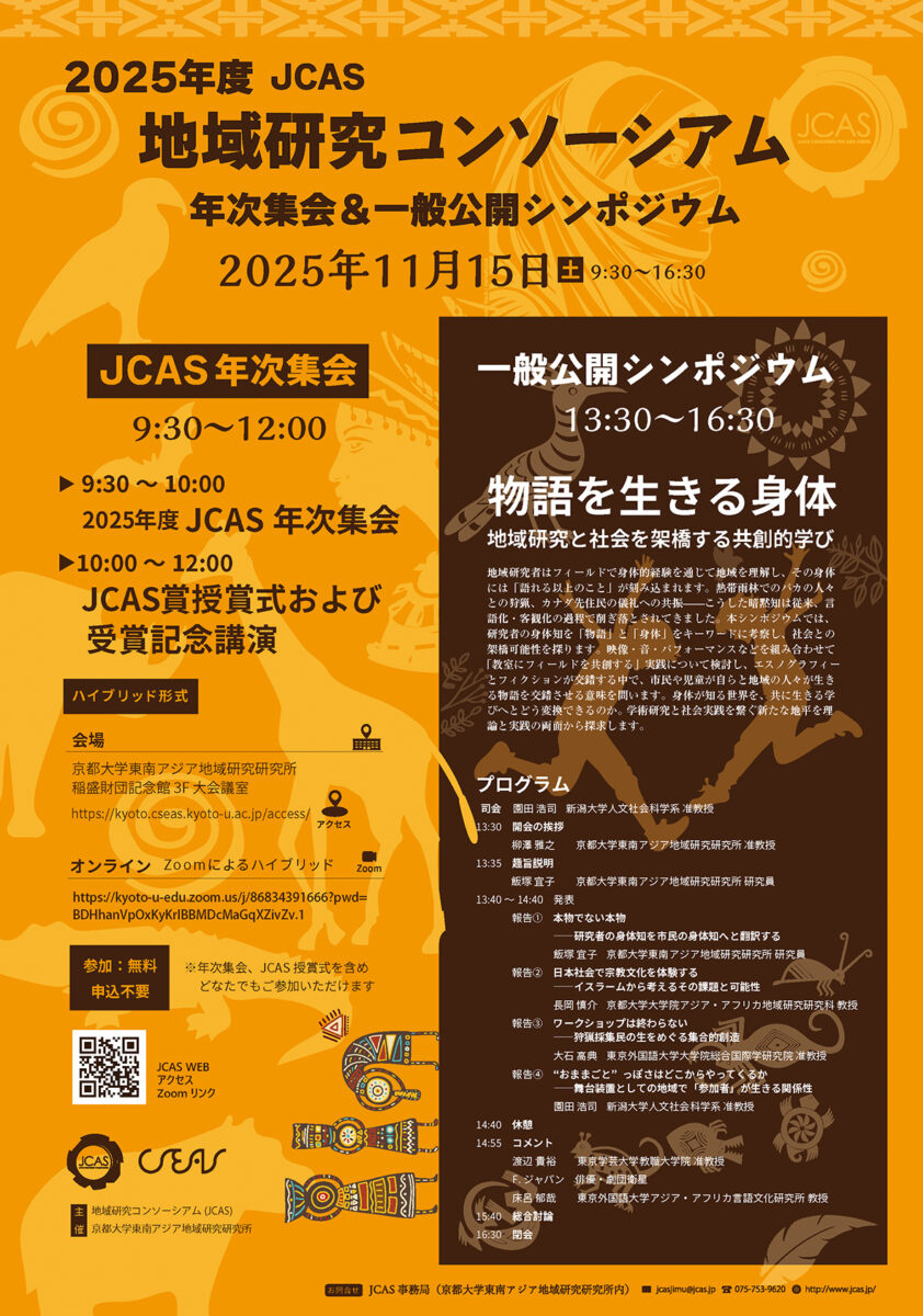 本シンポジウムでは、地域研究者の身体知について「物語」と「身体」をキーワードに考察し、如何にそれらを社会と架橋し、市民や児童の学びとして共有し得るかを探求します。「科学」は現象を細分化し分析していきますが、「物語」は関係のなかで生み出されます。人間が生きる上での「物語」の重要性は先人の多くが語るところであり、地域集団において、宗教的なものであれ伝説や民話であれ、物語はしばしば人々の存在や深い「心」の領域に関わるものです。身体と心は切り離せません。身体レベルで生きられる物語と共に地域の暮らしや相互関係があるという動態を、研究者も身体レベルで捉えているといえるでしょう。