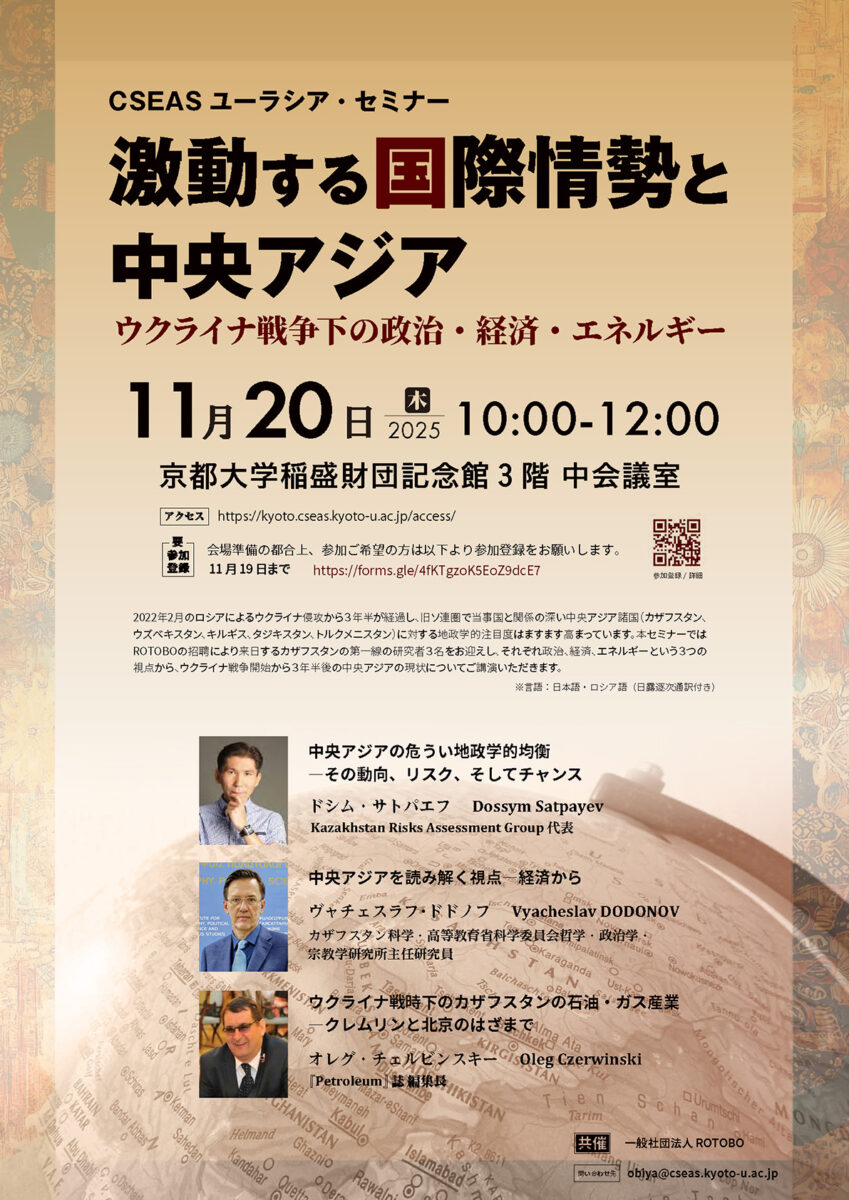 2022年2月のロシアによるウクライナ侵攻から3年半が経過し、旧ソ連圏で当事国と関係の深い中央アジア諸国(カザフスタン、ウズベキスタン、キルギス、タジキスタン、トルクメニスタン)に対する地政学的注目度はますます高まっています。本セミナーではROTOBOの招聘により来日するカザフスタンの第一線の研究者3名をお迎えし、それぞれ政治、経済、エネルギーという3つの視点から、ウクライナ戦争開始から3年半後の中央アジアの現状についてご講演いただきます。