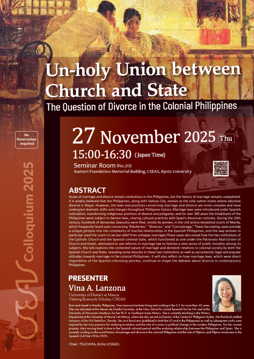 Issues of marriage and divorce remain contentious in the Philippines, but the history of marriage remains unexplored. It is widely believed that the Philippines, along with Vatican City, remain as the only nation-states where absolute divorce is illegal. However, the laws and practices concerning marriage and divorce are more complex and have undergone dramatic shifts and changes throughout Philippine history. Marriage laws were introduced under Spanish colonialism, transforming indigenous practices of divorce and polygamy; and for over 300 years the inhabitants of the Philippines were subject to Iberian laws, sharing cultural practices with Spain’s American colonies. During the 19th century, hundreds of demandas (lawsuits) were filed, mostly by women, in the civil and ecclesiastical courts of Manila, which frequently heard suits concerning “Adulteries,” “Divorces,” and “Concubinage.” These fascinating cases provide a unique glimpse into the complexity of marital relationships in the Spanish Philippines, and the way women in particular used the courts to secure relief from unhappy marriages. These cases also reveal how the two institutions of the Catholic Church and the Spanish colonial state, which functioned as one under the Patronato Real (Union of Church and State), attempted to use reforms in marriage law to fashion a new sense of public morality among its subjects. My talk explores the contested nature of marriage and domestic relations in colonial society by both the Spanish Church and State, revealing some disunity in these two institutions as well as sacramental, legal and popular attitudes towards marriage in the colonial Philippines. It will also reflect on how marriage laws, which were direct impositions of the Spanish colonizing process, continue to shape the debates about divorce in contemporary Philippines.